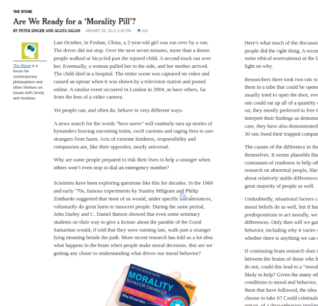 How does the article relate the discussion of a "morality pill" to the concept of free will and personal choice?