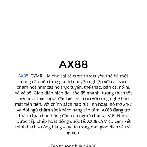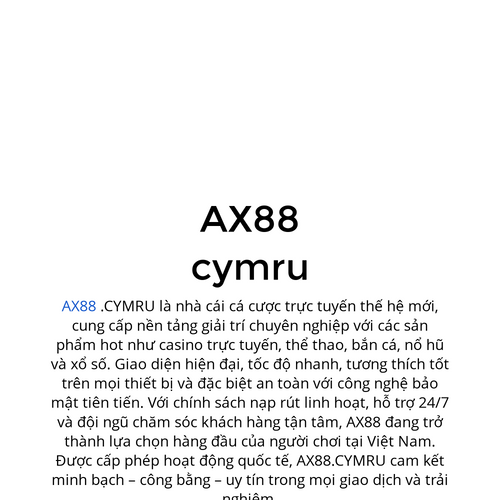 AX88 .CYMRU là nhà cái cá cược trực tuyến thế hệ mới, cung cấp nền tảng giải trí chuyên nghiệp với các sản phẩm hot như casino trực tuyến, thể thao, bắn cá, nổ hũ và xổ số. Giao diện hiện đại, tốc độ nhanh, Website: https://ax88.cymru/