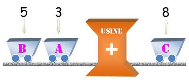 De sorte que si A contenait 3 patates et B contenait 5 patates, le wagonnet C va sortir de l'usine addition chargé de 3 + 5 = 8 patates.