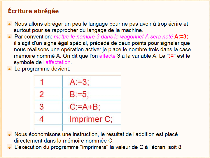 Ici, pour dire mettre 10 dans la mémoire nommée Max, on utilise le symbole ":=". On lit: M prend la valeur 10. C'est une affectation.