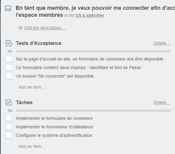 Les tests d'acceptance : Ce sont les spécifications de l'US. Les développements doivent les respecter pour que l'US soit valide.