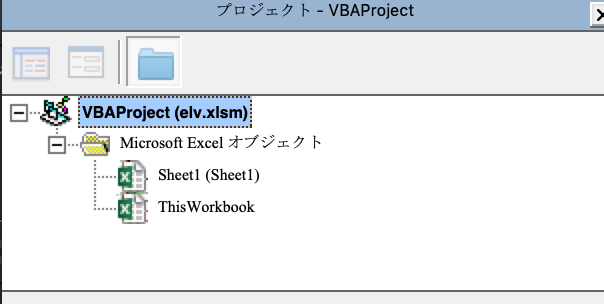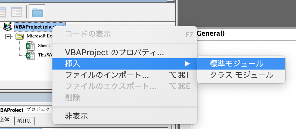 - プロジェクトウィンドウの今作ったelv.xlsmを右クリック挿入→標準モジュール