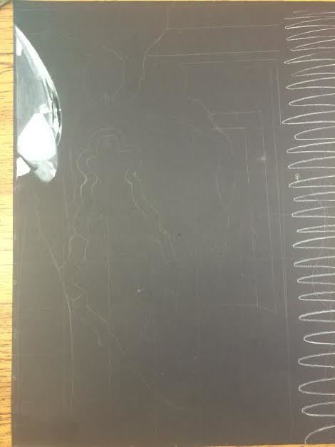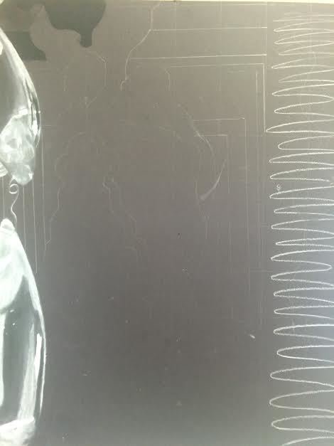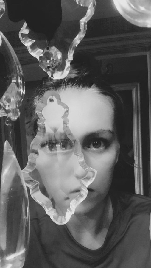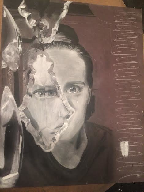 I applied the principles of rhythm and emphasis in my work. The principle of rhythm is found in the smoothness in the glass and the eyelashes on the face. I tried to put emphasis on the face, and even more in the chandelier piece that I'm looking through.