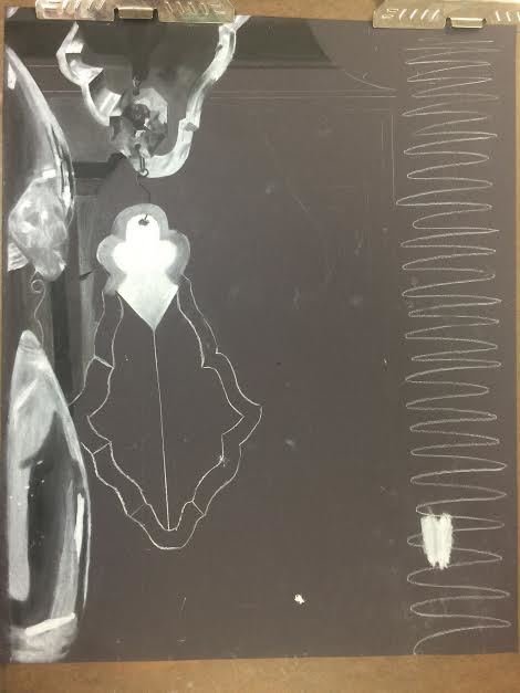 I used the elements of contrast and form in my work. The use of charcoal exaggerates the contrast in the picture, particularly in the glass pieces of the chandelier. The chandelier is also where the element of form is most evident; by emphasizing lowlights and highlights, I tried to give the impression of multi-faceted and round pieces.