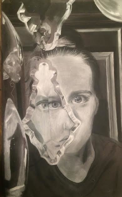 My subject matter in this piece consisted of myself and a chandelier in our kitchen. I had just gotten home from volleyball practice and wanted nothing more than to flop on the couch and go to sleep, but I had too many responsibilities. As the years have gone on, I have increasingly become more busy. Right now I'm involved in Key Club, St. Jude Club, the volleyball team, House and All-School Councils, and the Bishop's Leadership Committee. I also have schoolwork, babysitting, and other chores to fit into my schedule, not to mention trying to get some amount sleep. You can see the mark of grey fatigue under my eyes, and my posture is droopy. However, you can also see the brightness in my eyes, the thing that somehow keeps me from collapsing from the two backpacks and drawing board I carry in every day. That is the content that I'm trying to convey in my piece.