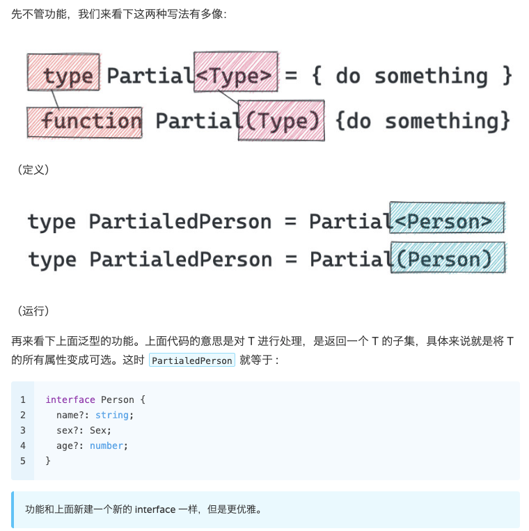 function Partial(Type) { type ans = 空类型 for(k in Type) { 空类型[k] = makeOptional(Type, k) } return ans } type PartialedPerson = Partial(Person)