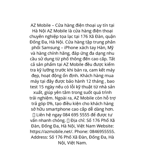 Website: https://azmobile.net/. Cửa hàng AZ Mobile – Điểm đến quen thuộc của tín đồ công nghệ AZ Mobile là địa chỉ mua sắm smartphone uy tín tọa lạc tại số 176 Phố Xã Đàn, Đống Đa, Hà Nội. Cửa hàng chuyên kinh doanh điện thoại Samsung và iPhone nguồn