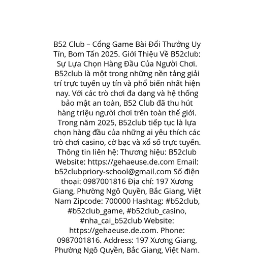 Website: https://gehaeuse.de.com. B52 Club – Cổng Game Bài Đổi Thưởng Uy Tín, Bom Tấn 2025. Giới Thiệu Về B52club: Sự Lựa Chọn Hàng Đầu Của Người Chơi. B52club là một trong những nền tảng giải trí trực tuyến uy tín và phổ biến nhất hiện nay. Với các