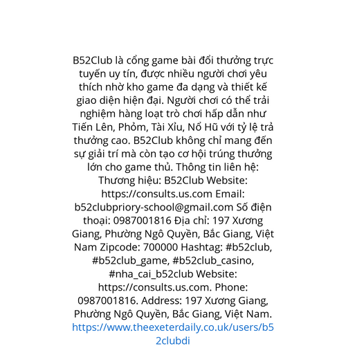 Website: https://consults.us.com. B52Club là cổng game bài đổi thưởng trực tuyến uy tín, được nhiều người chơi yêu thích nhờ kho game đa dạng và thiết kế giao diện hiện đại. Người chơi có thể trải nghiệm hàng loạt trò chơi hấp dẫn như Tiến Lên, Phỏm,