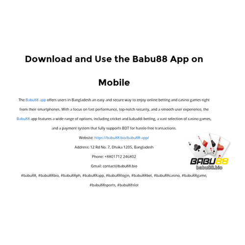 Babu88 app Website: https://babu88.bio/babu88-app/ Address: 12 Rd No. 7, Dhaka 1205, Bangladesh Phone: +8801712 246802 Gmail: contact@babu88.bio #babu88, #babu88bio, #babu88ph, #babu88app, #babu88login, #babu88bet, #babu88casino, #babu88game, #bab
