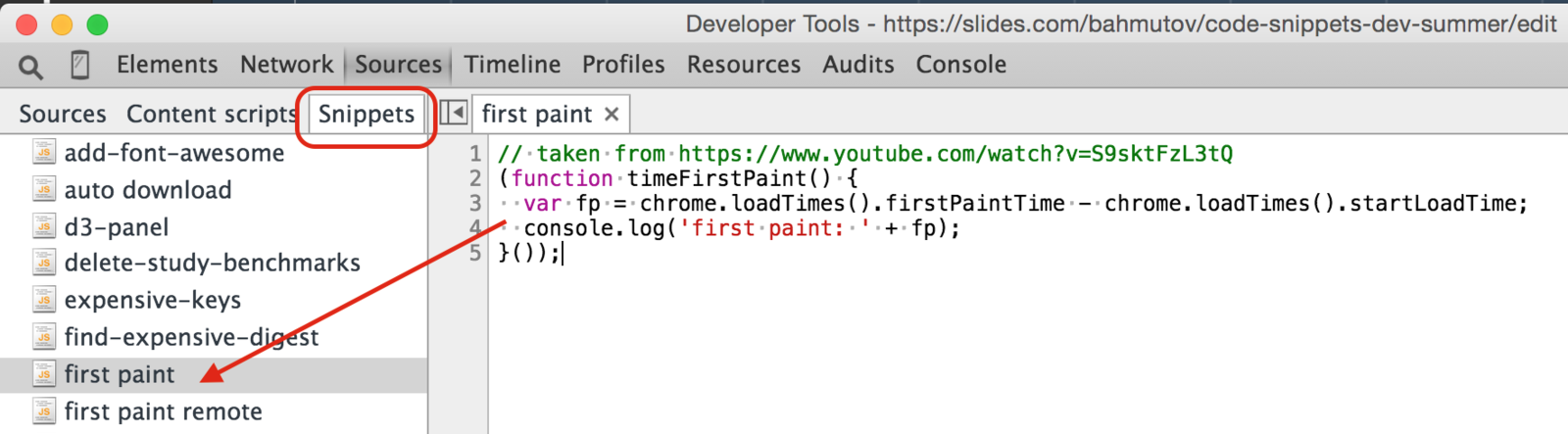 Chrome DevTools code snippets became my favorite tool when investigating performance bottlenecks in web applications. A JavaScript fragment can be stored as a named snippet in the "Sources" DevTools panel and executed in the current page's context, just as if it were a code executed in the browser's console.