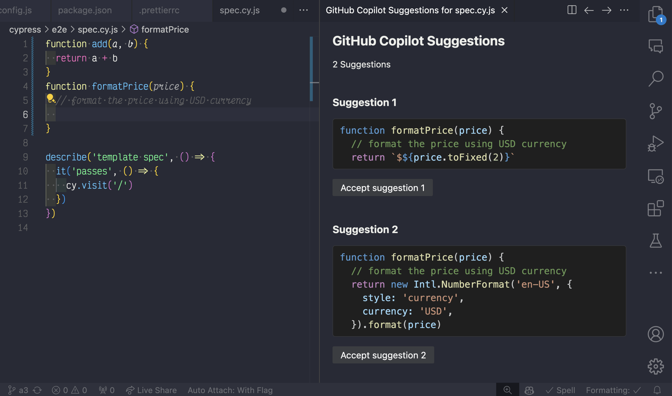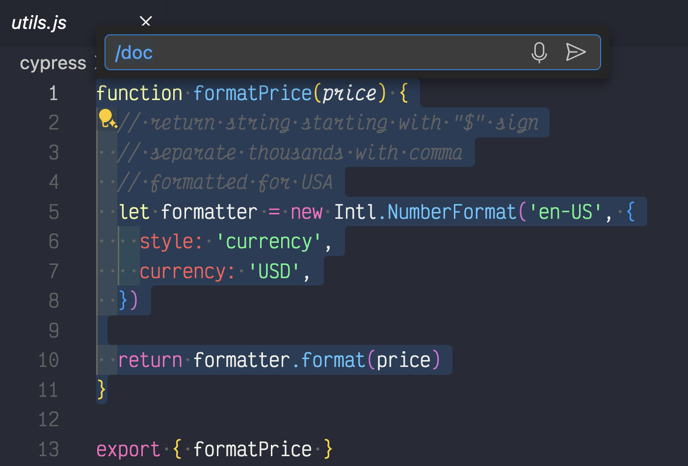 Add a comment like "// format the price using USD currency" to see better suggestions