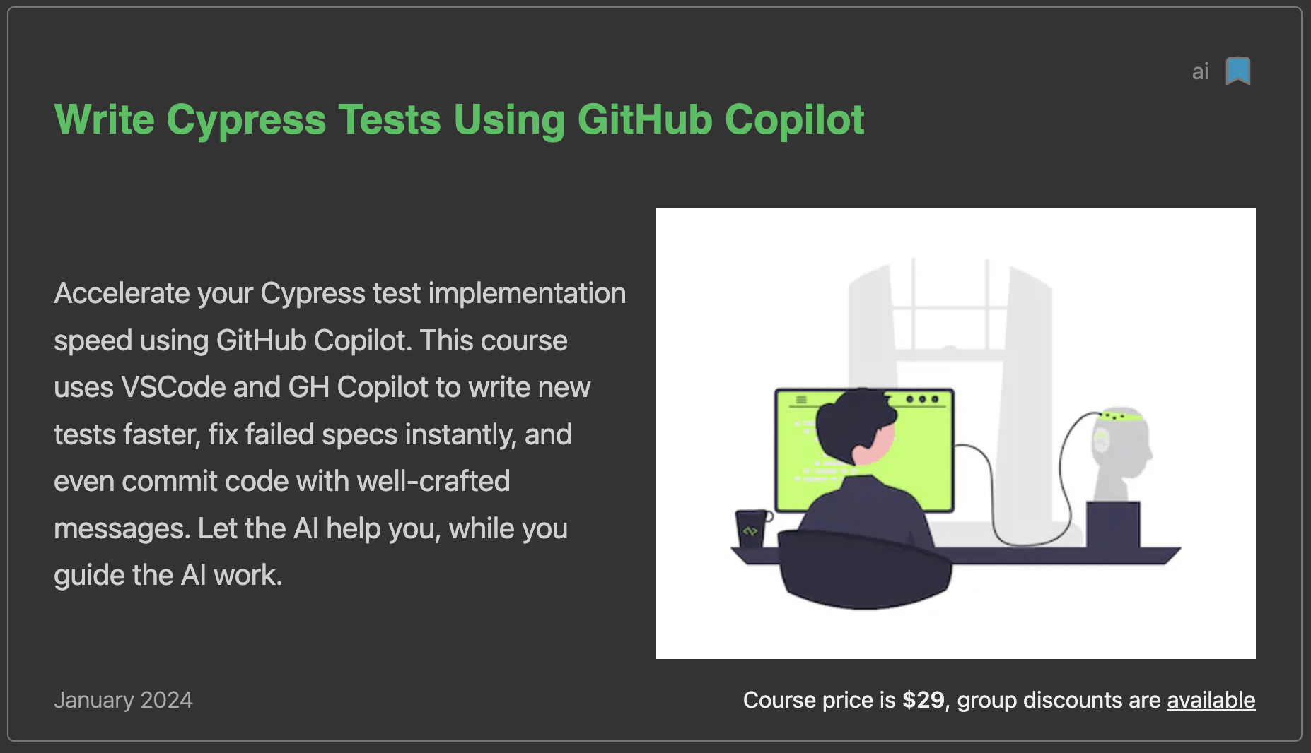 I want to show you the secret weapon I have used for the past year. The GitHub Copilot lets me write full tests quickly, fills the gaps in my knowledge of 3rd party tools, and even writes clear descriptive commit messages. But it is not a "press the button to do it all". You need to guide the AI to do the right thing, which takes experience, but most importantly, you need to decide _what_ you want the AI to do, step by step. Remember: AI is not going to replace you any time soon. But someone more productive with AI's help might get ahead. Let's learn Copilot for real-world test writing. It might change how you work. If you master it, Copilot becomes your super weapon. It is like playing Super Mario - in some games, you can dash quickly by pressing the "Y" button, but you need to be pointing in the right direction first. Presented at MaineJS 2024 video at https://www.youtube.com/watch?v=rTIwu8V2ujg