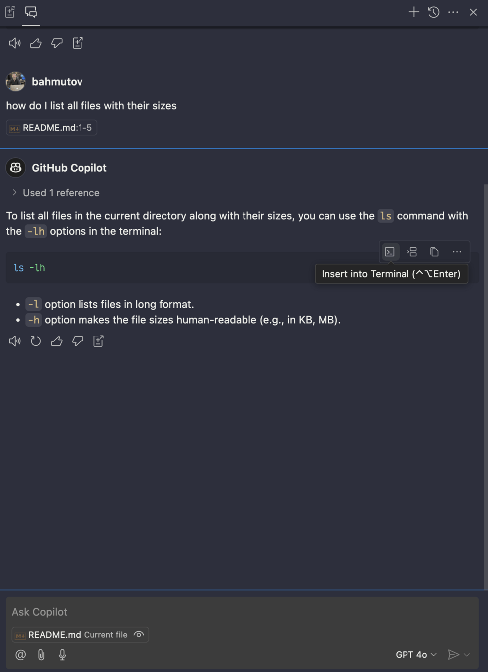Paste the Copilot answer right into VSCode built-in terminal