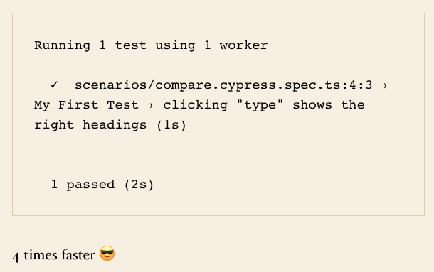 cy.contains('Success!').should('be.visible')expect(sum(2, 3)).to.equal(sum(4, 1))🚨