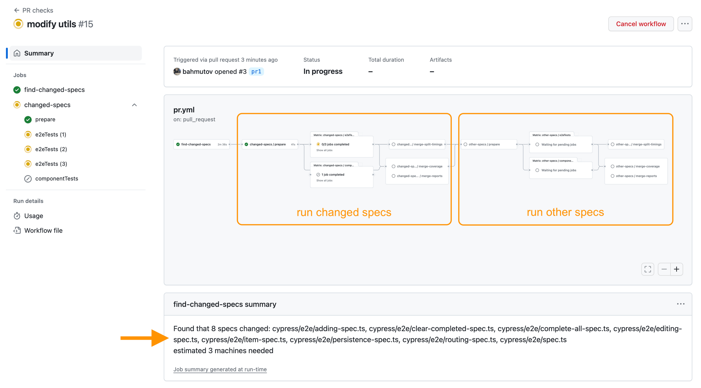job2: SPLIT=2 SPLIT_INDEX=1 npx cypress runThe first machine's summary