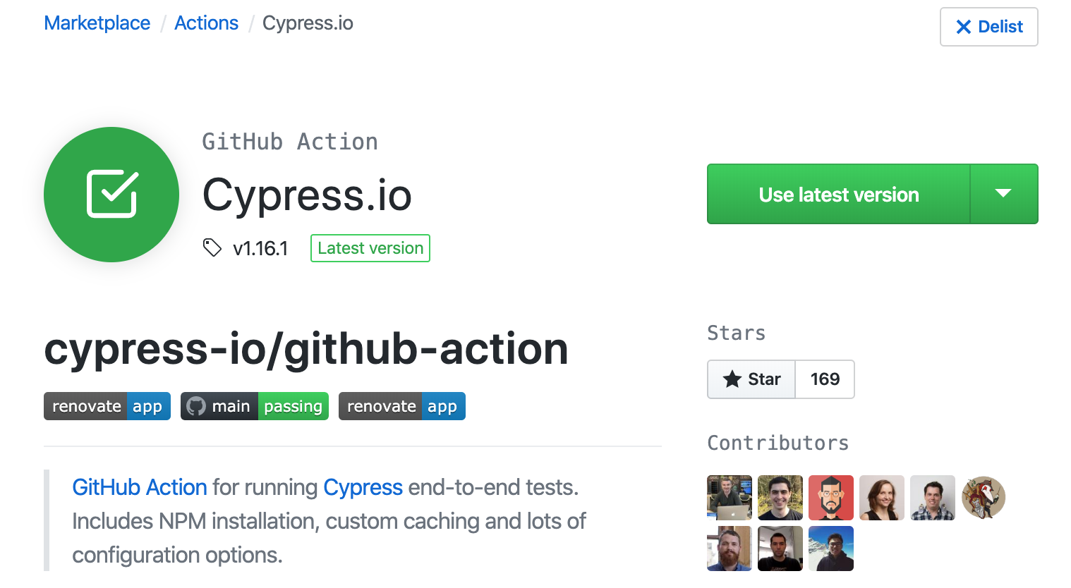 - uses: cypress-io/github-action@v1(does npm install and caching, runs the tests correctly, can build app and start server and more)