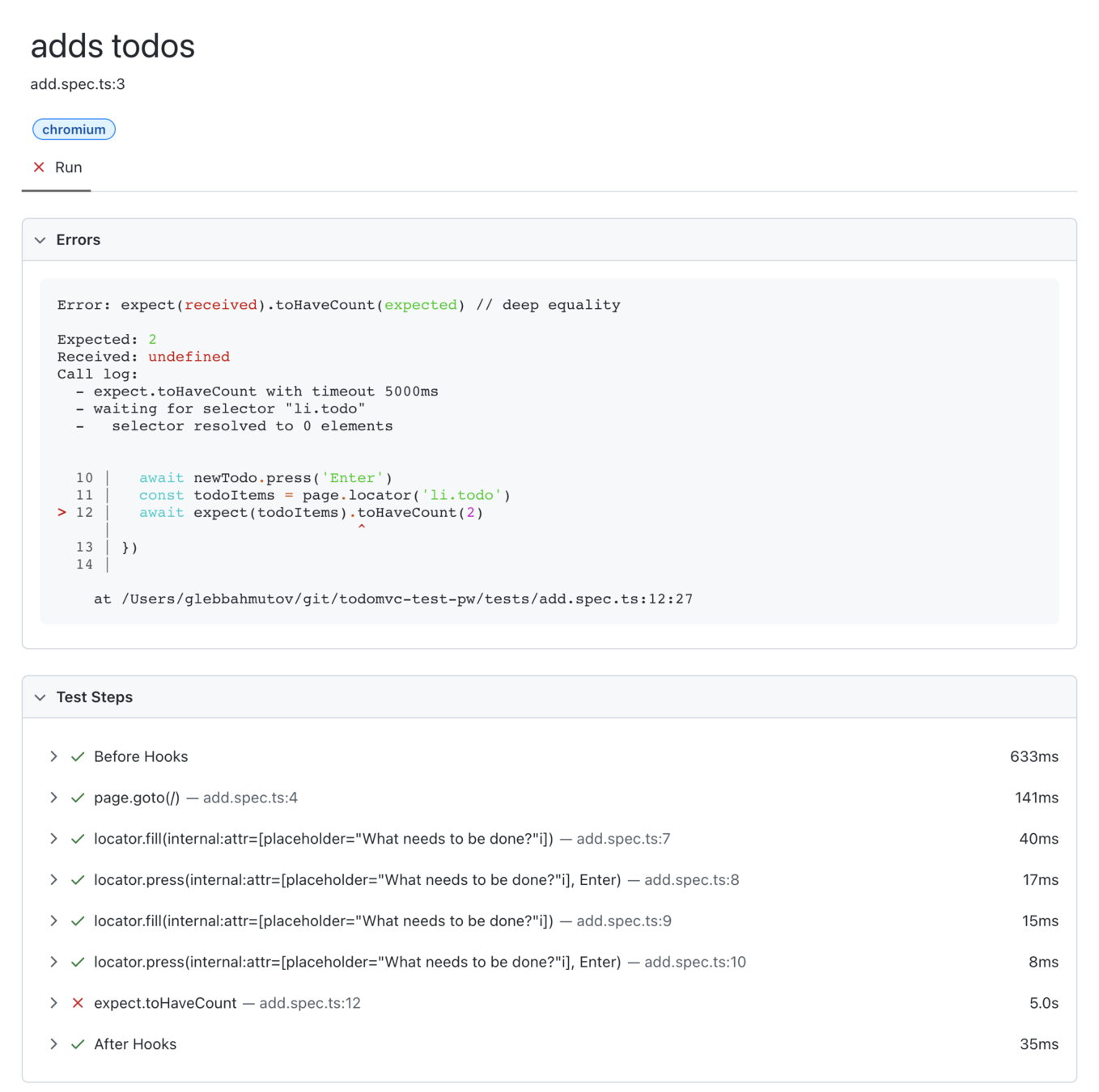 cy.get('li.todo').should('have.length', 2)There should be 2 items