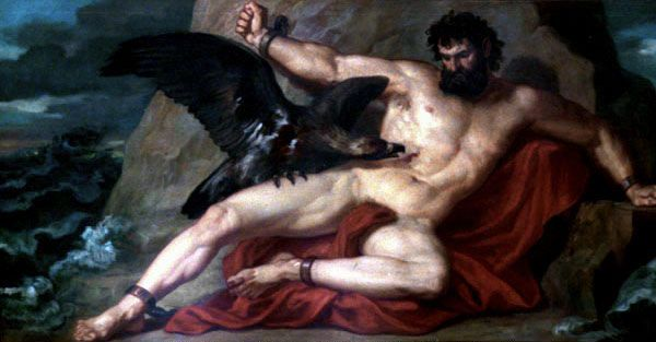 Prometeusz chcąc się zemścić na bogach zabił woła i podzielił go na części ( za puszke Pandory). Jedną częśćcią było mięso owinięte w skóry, a drugą kości owinięte w tłuszcz. Zeus wybrał gorszy wór z kośćmi, tłuszczem. Zgodnie z umową (między Zeusem a Prometeuszem) ludzie mają składać bogom tłuszcz i kości. Władca Olimpu ukarał Prometeusza, przykuwając go do skał Kaukazu. Samotny cierpiał katusze, podczas gdy przylatywał orzeł, który wyjadał wątrobę, która każdej nocy odrastała Prometeuszowi.