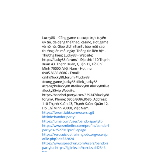 Website: https://bandori.party/user/339347/lucky88forum/. Lucky88 – Cổng game ca cược trực tuyến uy tín, đa dạng thể thao, casino, slot game và nổ hũ. Giao dịch nhanh, bảo mật cao, thưởng lớn mỗi ngày. Thông tin liên hệ: - Thương hiệu: Lucky88 - Web