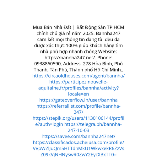 Website: https://bannha247.net/. Mua Bán Nhà Đất | Bất Động Sản TP HCM chính chủ giá rẻ năm 2025. Bannha247 cam kết mọi thông tin đăng tài đều đã được xác thực 100% giúp khách hàng tìm nhà phù hợp nhanh chóng Phone: 0938860590. Address: 278 Hòa Bình