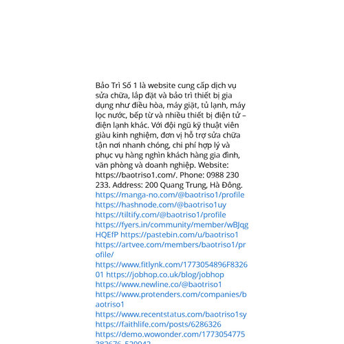 Website: https://baotriso1.com/https://baotriso1.com/ Bảo Trì Số 1 là website cung cấp dịch vụ sửa chữa, lắp đặt và bảo trì thiết bị gia dụng như điều hòa, máy giặt, tủ lạnh, máy lọc nước, bếp từ và nhiều thiết bị điện tử – điện lạnh khác. Với đội ngũ kỹ thuật viên giàu