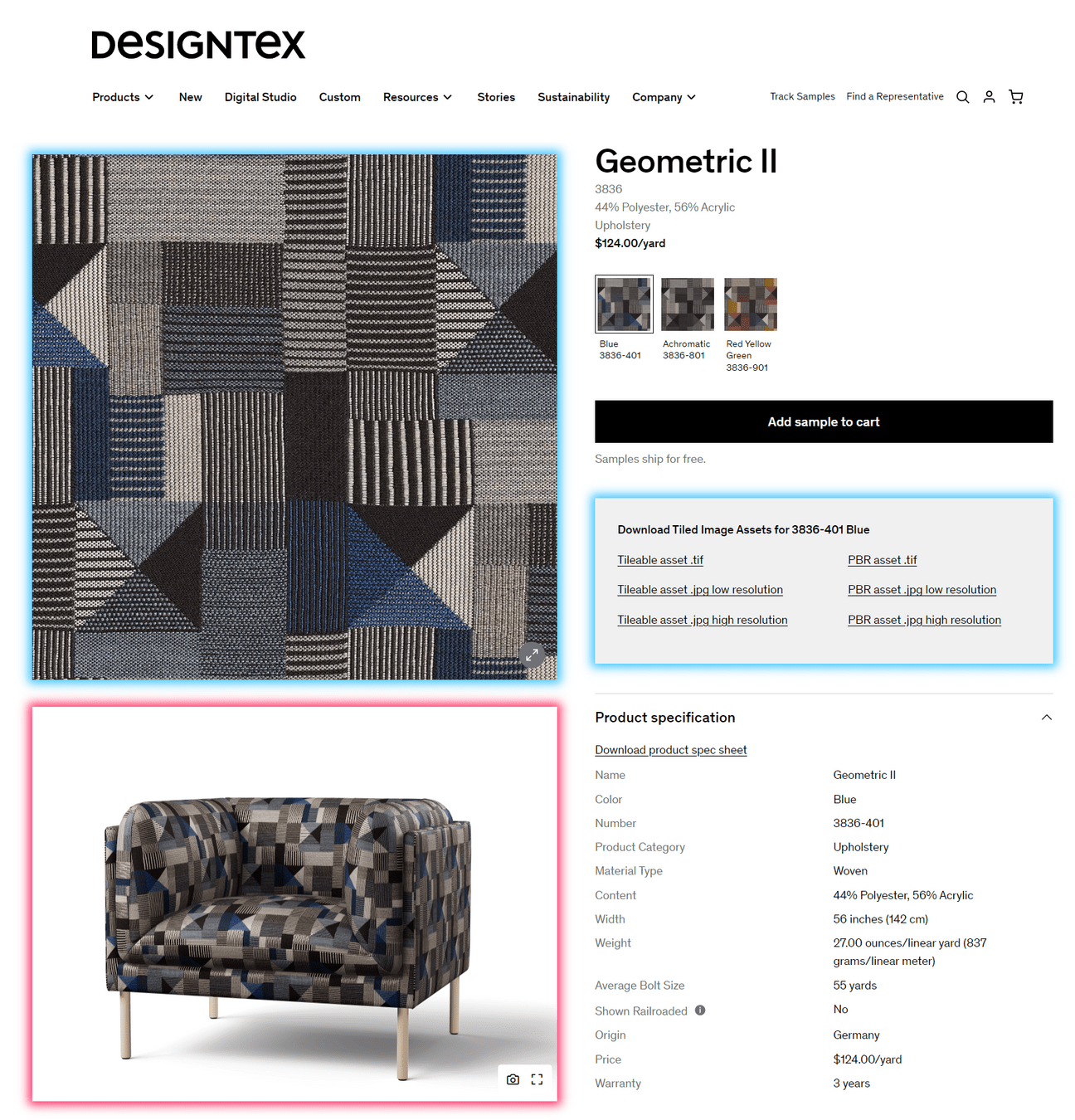 Next to generating images the Designtex automatically integrates (through an API) a 3D viewer and various data exports (tileable image, thumbnail etc) into their website. This demonstrates the true value of the ecosystem: all of the content on the Designtex webpage is done through the colormass Platform. Previously Designtex used threekit.