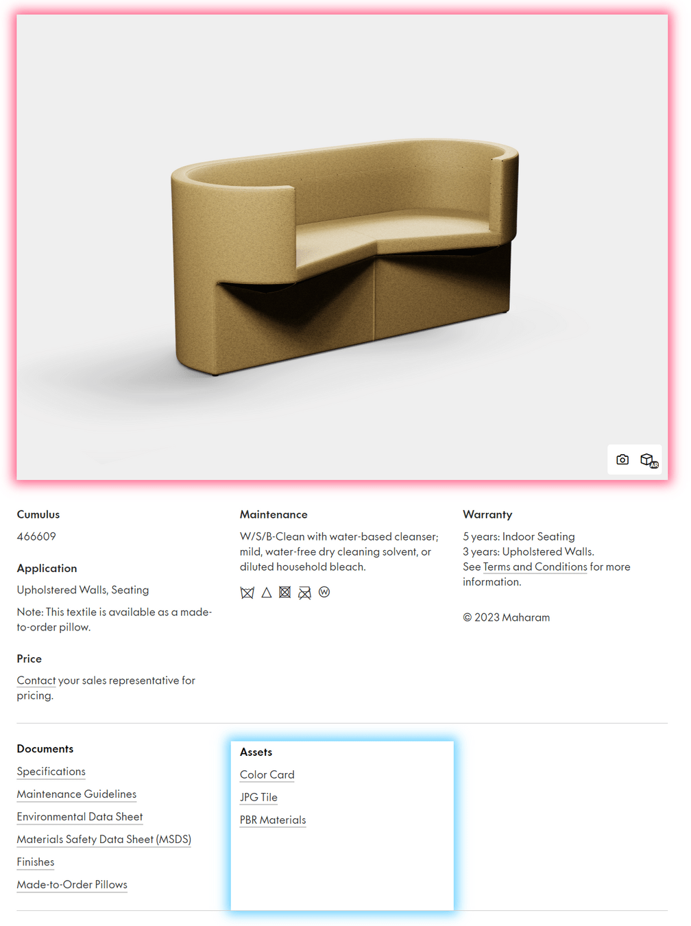 Maharam integrated the configurator to selected ranges. It is live since January 2023 on 20+ ranges and has been viewed more than 600.000 times in the first 6 months. Previously maharam used Cylindo.