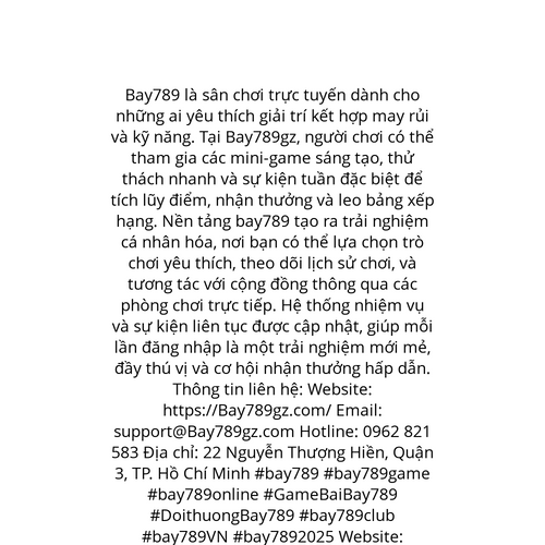 Website: https://Bay789gz.com/. Bay789 là sân chơi trực tuyến dành cho những ai yêu thích giải trí kết hợp may rủi và kỹ năng. Tại Bay789gz, người chơi có thể tham gia các mini-game sáng tạo, thử thách nhanh và sự kiện tuần đặc biệt để tích lũy điểm,