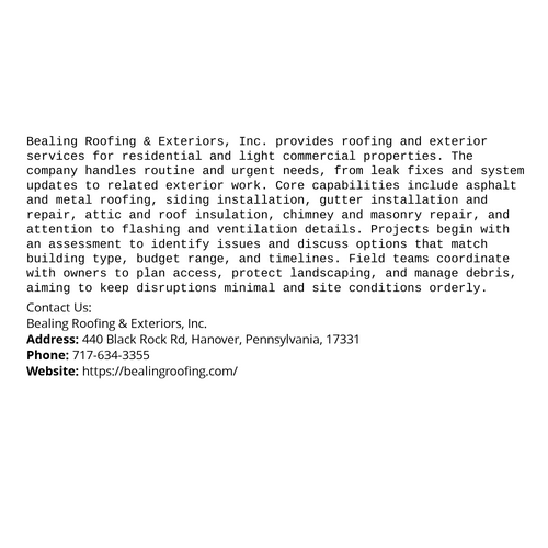 Address: 440 Black Rock Rd, Hanover, Pennsylvania, 17331 Hours: Mon–Sun: 07:00 – 19:00 Phone: 717-634-3355 Company Email: sales@bealingroofing.com Website URL: https://bealingroofing.com/