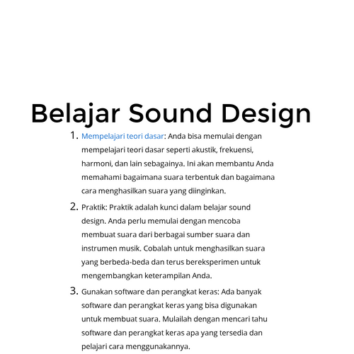 Sound design adalah seni dan ilmu menciptakan atau memanipulasi suara untuk menciptakan pengalaman audio yang menyenangkan atau sesuai dengan tujuan tertentu. Sound design umumnya diterapkan dalam produksi film, televisi, video game, dan media interaktif lainnya. Dalam sound design, terdapat beberapa elemen penting yang harus dipertimbangkan, seperti pilihan instrumen, efek suara, tempo, dinamika, dan mixing. Selain itu, peran sound designer juga termasuk memilih lokasi rekaman dan mengedit audio untuk mencapai hasil akhir yang diinginkan. Salah satu contoh penggunaan sound design yang berhasil adalah dalam film-film Hollywood. Penggunaan efek suara yang tepat dapat memberikan pengalaman audio yang intens dan membangun ketegangan dalam adegan yang menegangkan. Efek suara juga dapat membantu menciptakan suasana yang tepat untuk menggambarkan lokasi atau situasi tertentu. Sound design juga sangat penting dalam industri video game. Dalam game, sound design dapat menciptakan dunia yang hidup dan mendalam, serta meningkatkan pengalaman bermain game. Efek suara seperti suara tembakan atau ledakan dapat memberikan pemain pengalaman yang lebih nyata dan menegangkan. Baca Juga Artikel Cara Belajar Sound Design : Belajar Sound Design Dalam kesimpulannya, sound design adalah suatu seni dan ilmu yang penting dalam industri kreatif seperti film, televisi, dan video game. Sound design dapat menciptakan pengalaman audio yang mendalam dan membangun suasana yang tepat untuk mencapai tujuan tertentu. Selain itu, sound design juga dapat digunakan dalam media interaktif seperti aplikasi, situs web, dan virtual reality. Dalam hal ini, sound design dapat menciptakan pengalaman audio yang lebih personal dan membangun koneksi antara pengguna dan produk atau layanan yang disajikan. Untuk menjadi seorang sound designer yang sukses, seseorang harus memiliki pemahaman yang baik tentang prinsip-prinsip dasar musik dan teknologi audio. Selain itu, seseorang juga harus memiliki kreativitas yang tinggi dan kemampuan untuk berkolaborasi dengan tim kreatif lainnya. Ada banyak alat dan software yang dapat digunakan dalam sound design, seperti synthesizer, mixer, dan digital audio workstation (DAW). DAW merupakan alat yang sangat penting dalam sound design karena memungkinkan sound designer untuk merekam, mengedit, dan menggabungkan audio dalam satu proyek. Dalam industri kreatif, sound design menjadi bagian yang sangat penting dan strategis. Penggunaan sound design yang tepat dapat meningkatkan kualitas produk atau layanan yang dihasilkan, serta memberikan pengalaman yang lebih mendalam dan mengesankan bagi pengguna. Namun, perlu diingat bahwa sound design bukanlah hal yang mudah dan sederhana. Seorang sound designer harus memahami dengan baik tujuan dan kebutuhan klien atau produser, serta mampu menghasilkan karya yang sesuai dengan ekspektasi dan standar kualitas yang tinggi. Untuk menjadi seorang sound designer yang handal, sebaiknya seseorang belajar dari pengalaman dan mendapatkan pelatihan atau pendidikan yang memadai. Ada banyak kursus dan program pelatihan yang tersedia di institusi pendidikan dan online, serta banyak sumber belajar lainnya seperti tutorial dan buku tentang sound design. Di Indonesia, industri kreatif berkembang dengan pesat, termasuk dalam bidang sound design. Banyak perusahaan dan studio produksi yang membutuhkan sound designer untuk menghasilkan karya-karya berkualitas. Oleh karena itu, ini adalah saat yang tepat untuk memulai karir dalam bidang ini, terutama bagi mereka yang memiliki minat dalam seni dan teknologi audio.