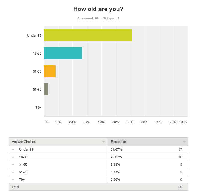 On average, our main responses were from females, and the main age range who answered were under 18.