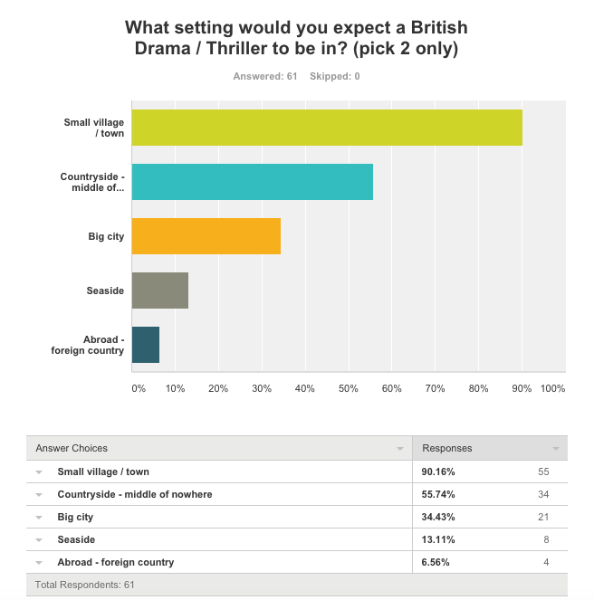 The answers show that overall people expect a British drama / thriller genre TV show or film to be set in a small town or village in the countryside. Our narrative is set in a small seaside town, therefore subverting the audience's expectations of this genre, which will make it more interesting when they watch our trailer.