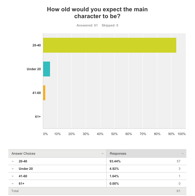 Overall, the results show that on average people would expect the storyline to be based on a protagonist within the age range 20-40, set in an isolated area with a thought provoking ending, including themes such as revenge, crime and murder as the most prominent themes.