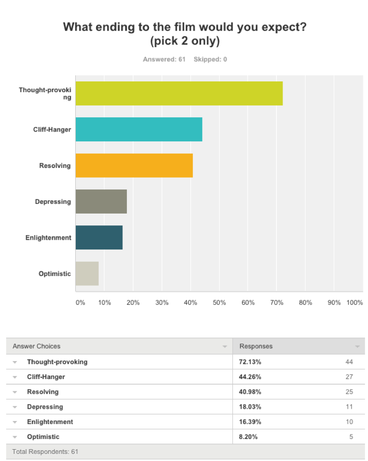 The questionnaire shows that an audience would mainly expect a thought-provoking ending to a film or TV show of this genre, with either a resolution at the end or ending on a cliff-hanger. We have decided to make our narrative have a resolving ending, to avoid leaning into a horror genre, and to try to create an active audience where they consciously have to think and reflect on the film rather than a passive audience.