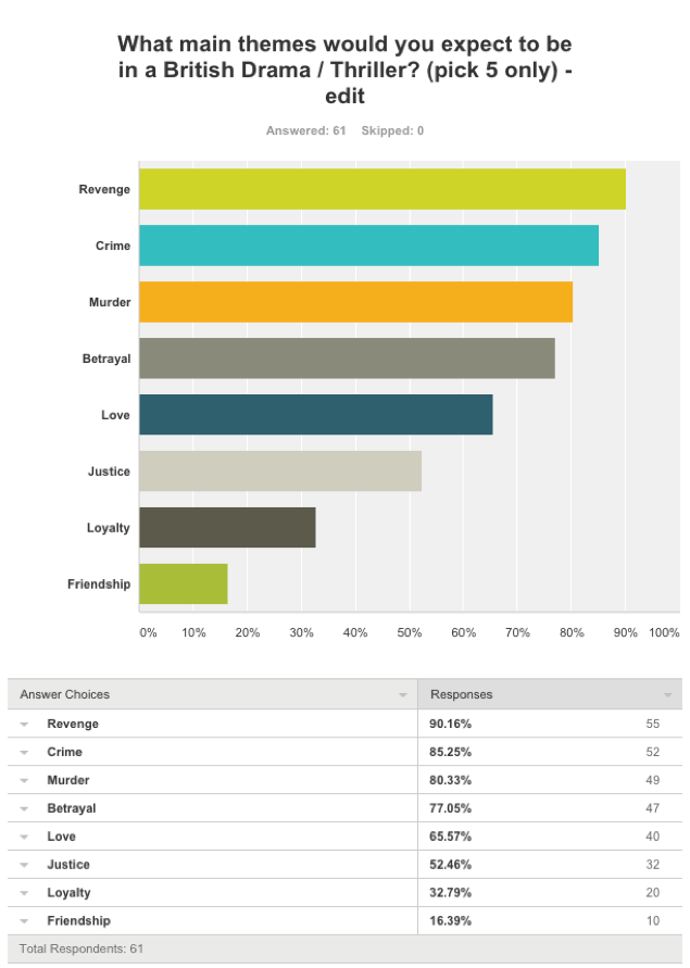 We produced a Survey Monkey to find out what an audience would expect from a British drama / thriller genre. We used social media (Facebook) to send out the survey and gather the information. Here is an analysis of the results.