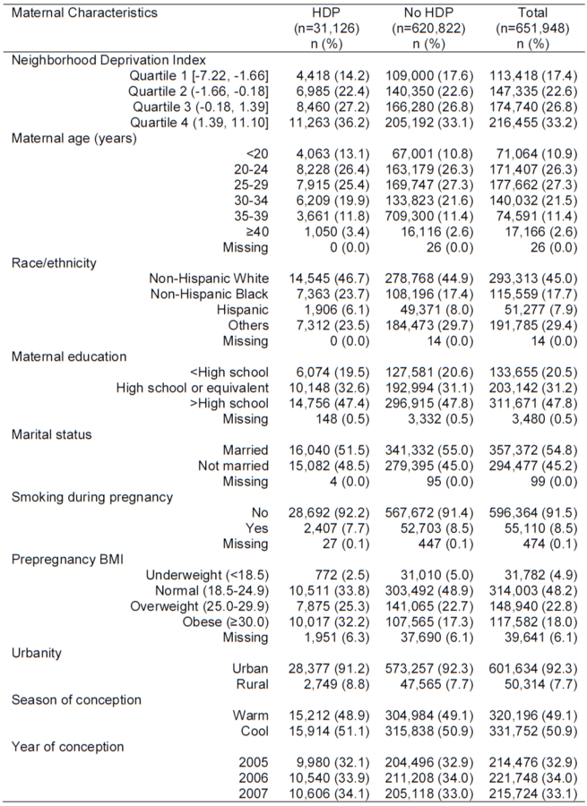 Urbanity, ozone exposure, and neighborhood SES have been linked to HDP.