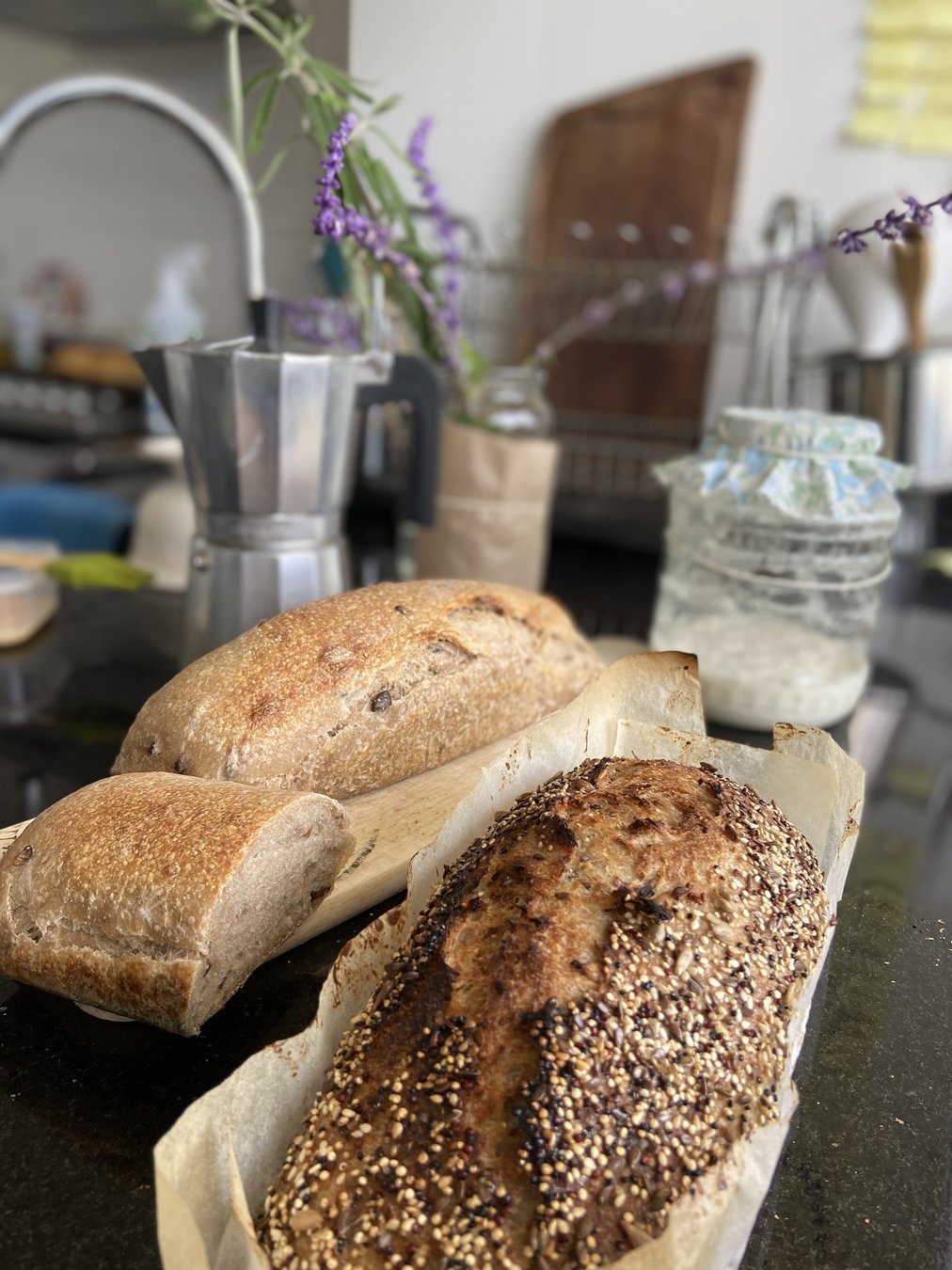 Masa madre, miel, semillas de girasol, avena, quinoa, sésamo, centeno y linaza.