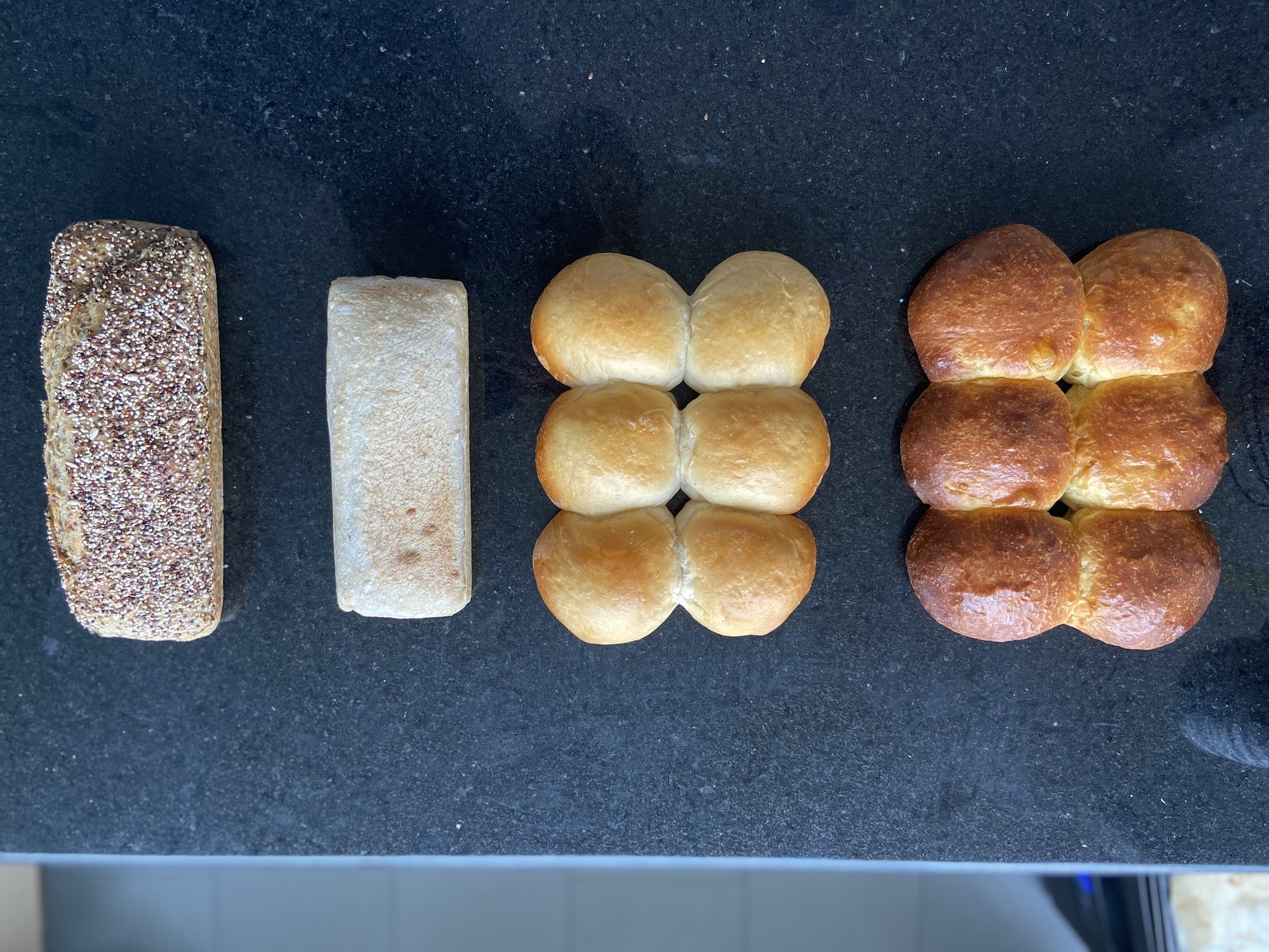 6 kombuchas, 1 pan integral multigrano, 1 pan de leche.