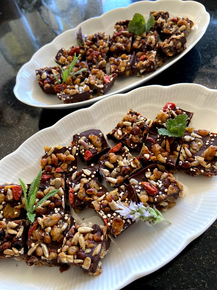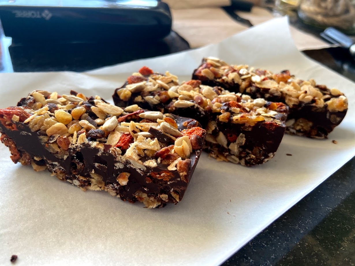 Trigo de mote fermentado tostado con mantequilla, avena tostada, goji berries, semillas de girasol y chocolate amargo 65% cacao.