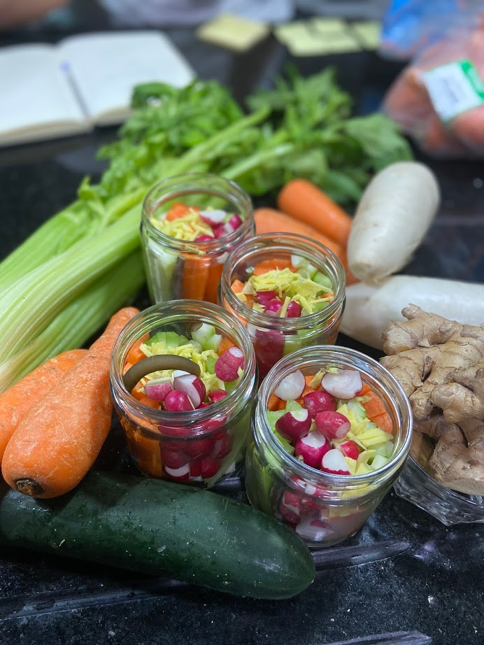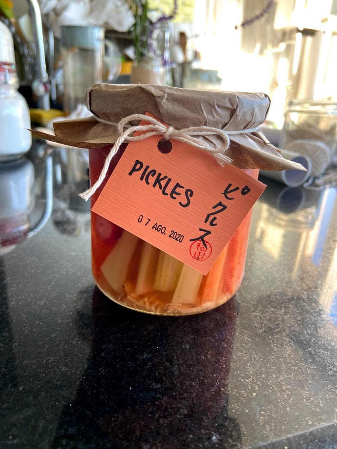 Verduras encurtidas en vinagre, cochayuyo, gengibre, azúcar y sal. Opciones: zanahoria, nabo, rabanito, apio y mix de la casa.