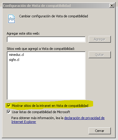 - Revisar que esté activado "Mostrar sitios de la Intranet de Vista de Compatibilidad"