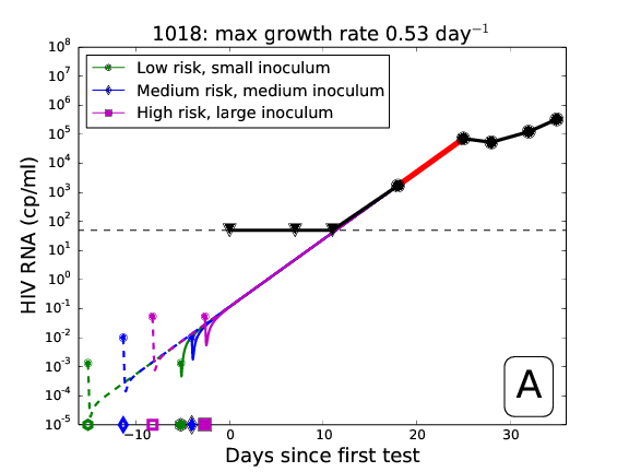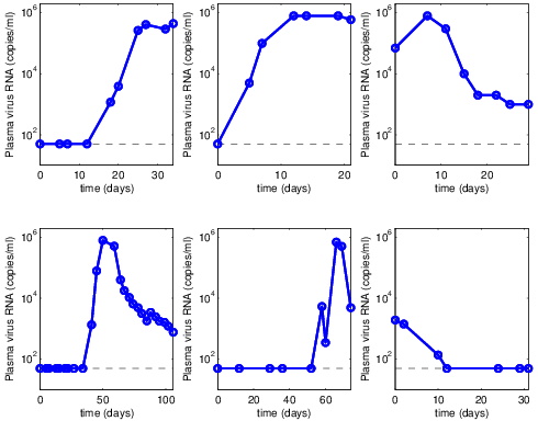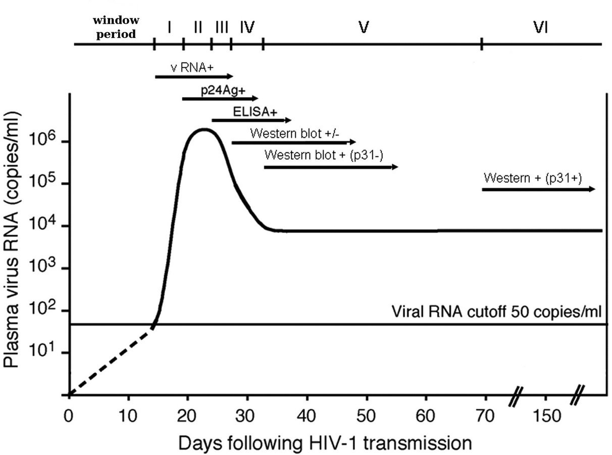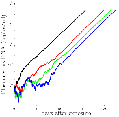 - What is the probability that the number of virions is large enough to be detectable by a HIV test at time t?