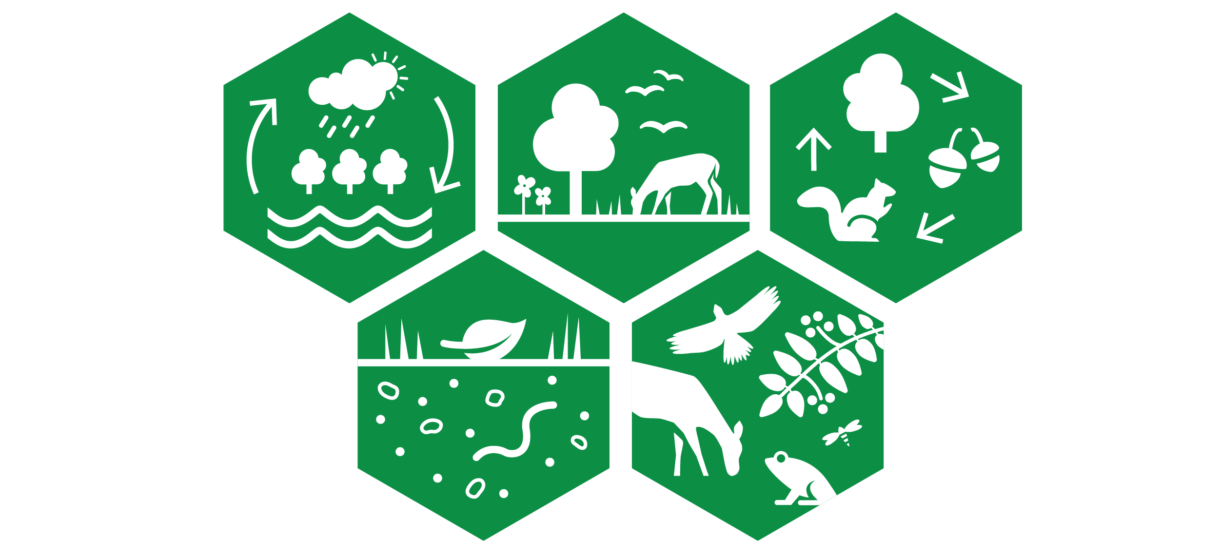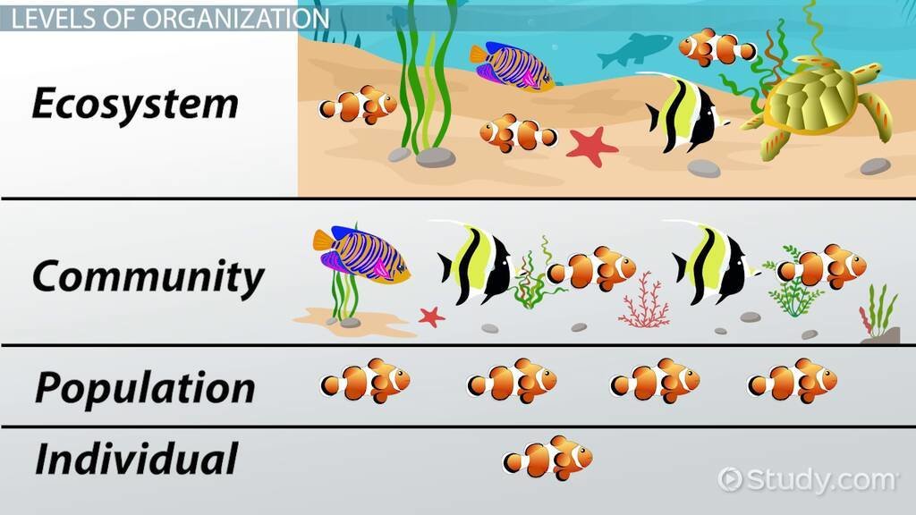 Ekosystemets levande delar är uppbyggda i tre nivåer, ett samhälle vari det finns flera populationer av olika sorters växt- och djurarter där varje art består av individer som gör så att ekosystemet fungerar.