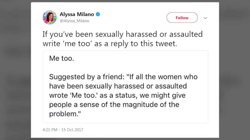 Efter att medie-mogulen Harvey Weinstein anklagats för en mängd sexuella övergrepp i oktober 2017 började kampanjen spridas viralt som en hashtag på sociala medier. Den 15:e oktober, 2017 postade den amerikanska skådespelerskan Alyssa Milano på Twitter: