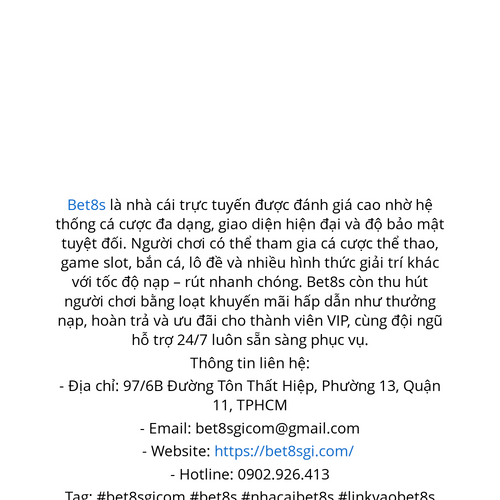 Bet8s là nhà cái trực tuyến được đánh giá cao nhờ hệ thống cá cược đa dạng, giao diện hiện đại và độ bảo mật tuyệt đối. - Website: https://bet8sgi.com/