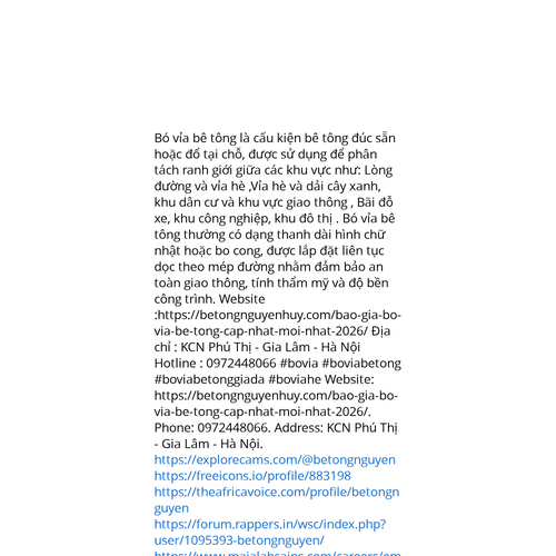 Website: https://betongnguyenhuy.com/bao-gia-bo-via-be-tong-cap-nhat-moi-nhat-2026/. Bó vỉa bê tông là cấu kiện bê tông đúc sẵn hoặc đổ tại chỗ, được sử dụng để phân tách ranh giới giữa các khu vực như: Lòng đường và vỉa hè ,Vỉa hè và dải cây xanh, k