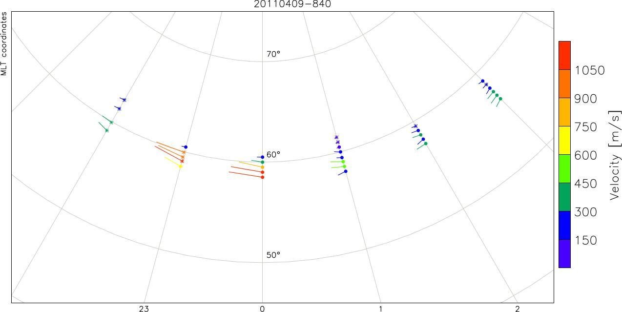 - During disturbed geomagnetic conditions velocities reach beyond 1500 m/s.