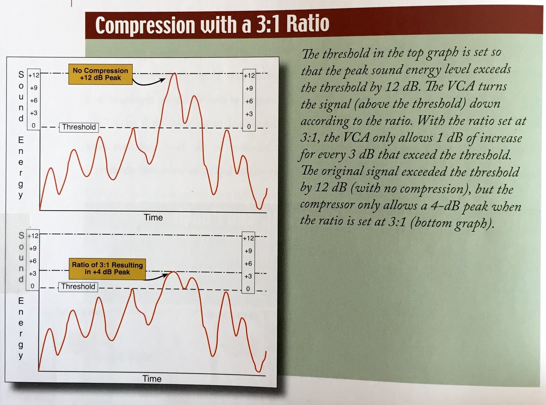 Compressors are dynamics processors. They change the dynamic range of a sound– the distance between the quietest and loudest part of the sound– by reducing peaks so quieter parts of the sound can raised.