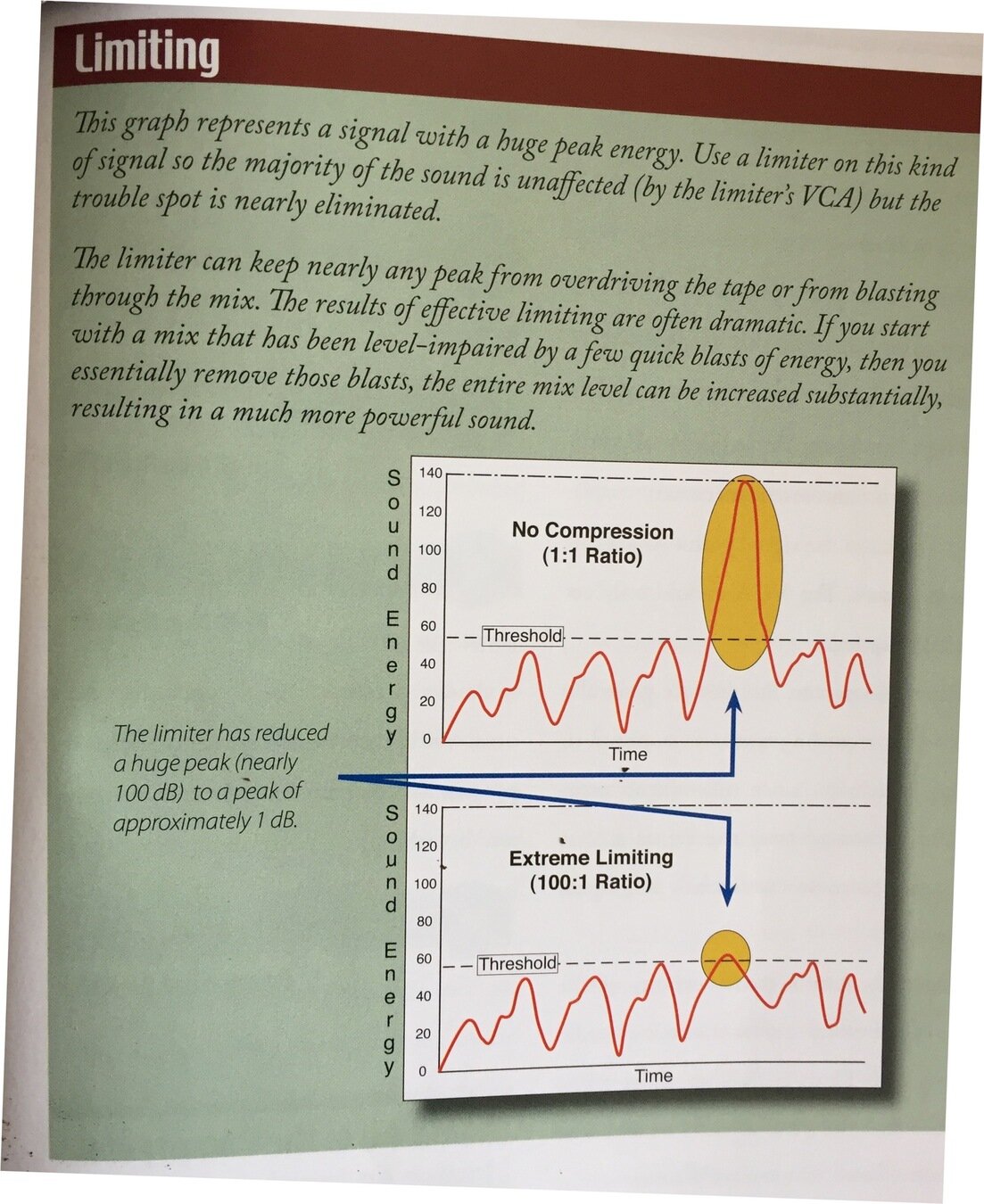 The limiter severely reduces any signal that is above its threshold. Limiting is essentially extreme compression (with a high threshold & high ratio).